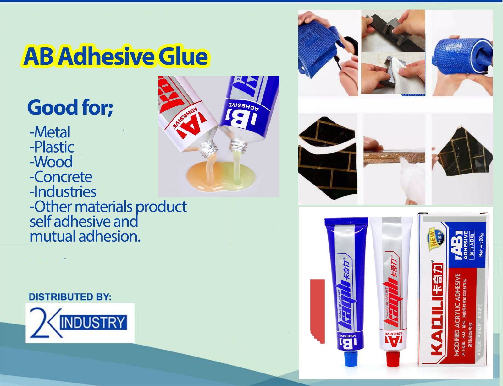 AB Glue is not suitable for the bonding of SNOW IRON (GALVANIZED SHEET)COPPER BRAS, ZINC, CELLULOID, POLYTETRAFLUOROETHYLENE POLYOLEFIN,POLYSILOXANE AND other products. Bonding GLASS PRODUCTS, the initial stregth is good, but due to the large expansion coefficient of the glass it will sometimes fall automatically. The bonding effect is not ideal for flexible products such as LEATHER,FABRIC, etc.